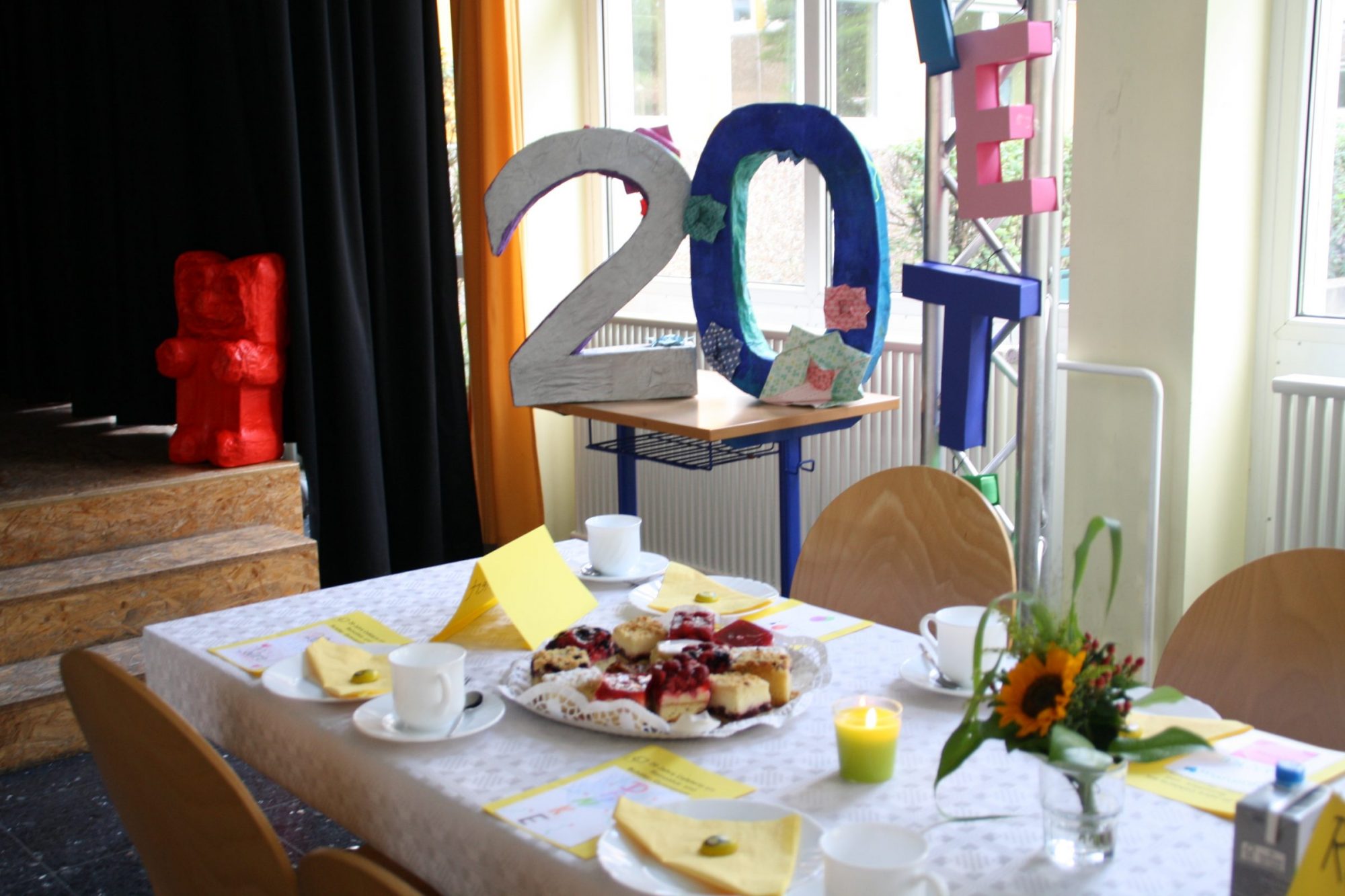 Die anschlie­ßen­de Fei­er am Nach­mit­tag begann um 15 Uhr mit einem Sekt­emp­fang, wel­chen die Schü­ler der Q1 orga­ni­sier­ten. Danach fand eine Anspra­che der jet­zi­gen Orga­ni­sa­to­ren der Cafe­te­ria, Frau Kohls­ted­de und Frau Kul­lik, statt. Die Aula wur­de aus­gie­big geschmückt und Kaf­fee und Kuchen wur­de den Gäs­ten ange­bo­ten. Unter den Gäs­ten befan­den sich vie­le wich­ti­ge Per­so­nen der Schu­le und zahl­rei­che Eltern. Anfangs gab es vie­le Dan­kes­re­den an die Eltern und im Anschluss wur­de die Stim­mung der Gäs­te durch den Auf­tritt des Unter­stu­fen­chors gelo­ckert. Die­ser Chor, beglei­tet von Frau Koplin am Kla­vier, kom­po­nier­te ein Lied über den All­tag der Cafe­te­ria. Außer­dem spiel­te die SV ein kur­zes Thea­ter­stück vor und der Leh­rer­chor trat auf. Die Fei­er bot eine Mög­lich­keit sich über die Erfah­run­gen, die in den ver­gan­ge­nen 20 Jah­ren gemacht wur­den, aus­zu­tau­schen. Dies rief vie­le Erin­ne­run­gen wach
