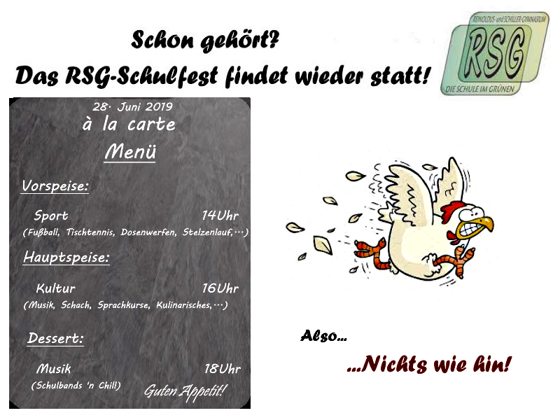 Auch in diesem Jahr lädt das Reinoldus- und Schiller-Gymnasium wieder zu einem Schulfest ein. Am Freitag, den 28. Juni, wird unter dem Motto „RSG à la carte – Von uns nur Beste“ gefeiert. Los geht es um 14 Uhr mit einer Fußballmeisterschaft und sportlichen Aktivitäten wie Stelzenlauf, Dosenwerfen, Tischtennis und vielem mehr. Um 16 Uhr geht es dann kulinarisch, musikalisch und kreativ weiter mit leckeren Speisen, Spielen, Kinderschminken, Basteln und vielem mehr. Ab 18 Uhr treten zu einem schönen Ausklang mit netten Gesprächen noch unsere Schulbands auf.