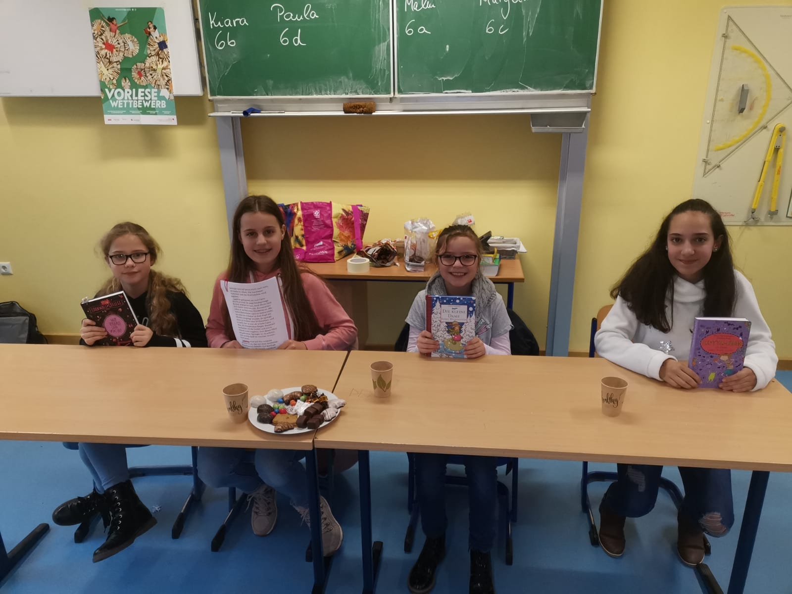 So spannende Texte, wie diesen hier aus dem Buch „Grüne Gurken“, lasen die Teilnehmerinnen des Lesewettbewerbes. Wie jedes Jahr fand wieder der berühmt-berüchtigte Vorlesewettbewerb in den sechsten Klassen statt, organisiert von Frau Thoben. Hierzu bestimmten alle sechsten Klassen die beste Leserin oder den besten Leser: Kiara aus der 6b, Paula aus der 6d, Malin aus der 6a und Maryam aus der 6c (siehe Foto). Sie traten am 9. Dezember 2019 in zwei Runden gegeneinander an.