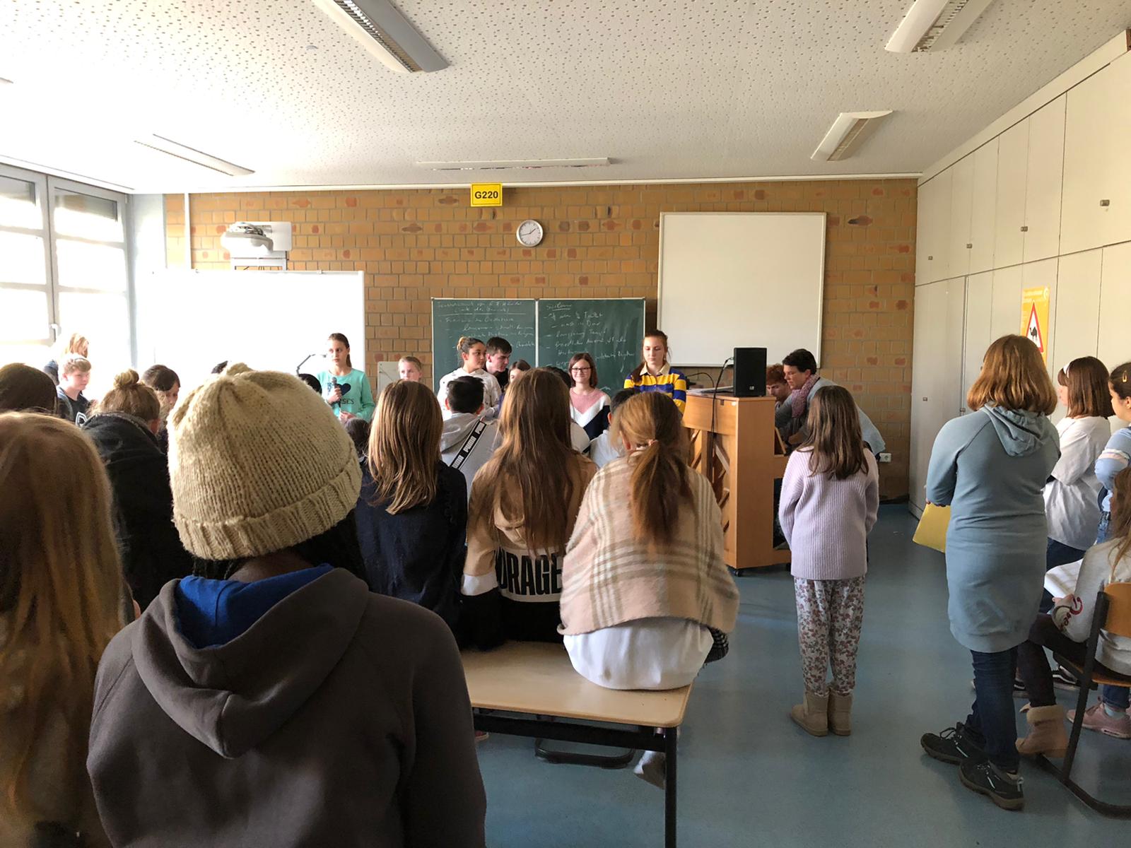 Die AG-Leiterin Frau Koplin hat mir heute die Möglichkeit geboten am Unterstufenchor teilzunehmen, um mir einen genaueren Einblick zu verschaffen. 50 Kinder aus der fünften bis siebten Klasse und ich frage mich: „Was erwartet mich heute im Unterstufenchor unserer Schule?“