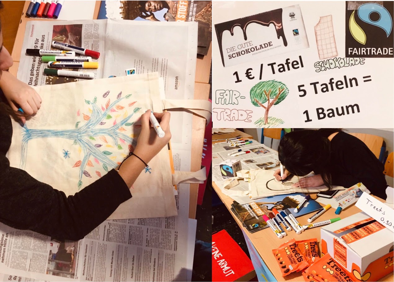Diesen Beitrag nutzte das Fairtrade-Team z.B. am Tag der offenen Tür und verkaufte dort unter anderem Schokolade und Baumwolltaschen, die von jedem selbst bemalt und nach Belieben gestaltet werden konnten.
