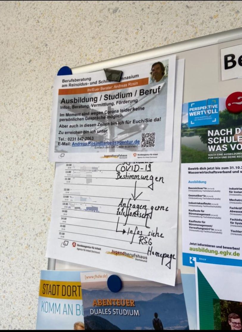 Wegen Corona mussten die persönlichen Sprechstunden in der Schule abgesagt werden, was sehr schade war. Da Herr Rosin im Home-Office ist und die Sprechstunden telefonisch von zuhause anbietet, war das aber alles kein Problem. Vor dem Gespräch hatte ich ungefähre Vorstellungen davon, was ich mal machen möchte und was nicht, aber eine sichere Entscheidung war das nicht.