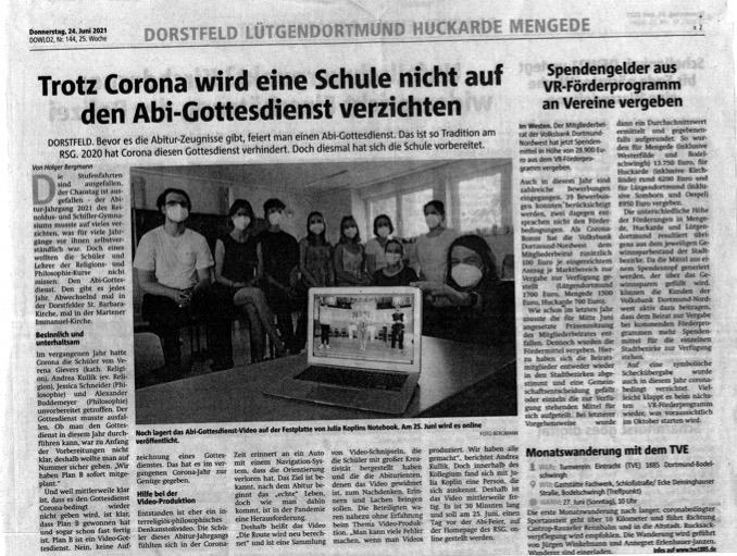 Corona hat die Jahrgangsstufe Q2 nicht davon abgehalten, einen Abiturgottesdienst zu feiern und zwar digital. Darüber berichteten auch die Ruhrnachrichten:
